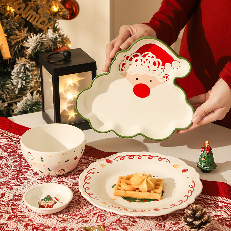 đȘ Charming Shapes â Signature Santa-face plate, scalloped dessert plate, matching bowls and cups.